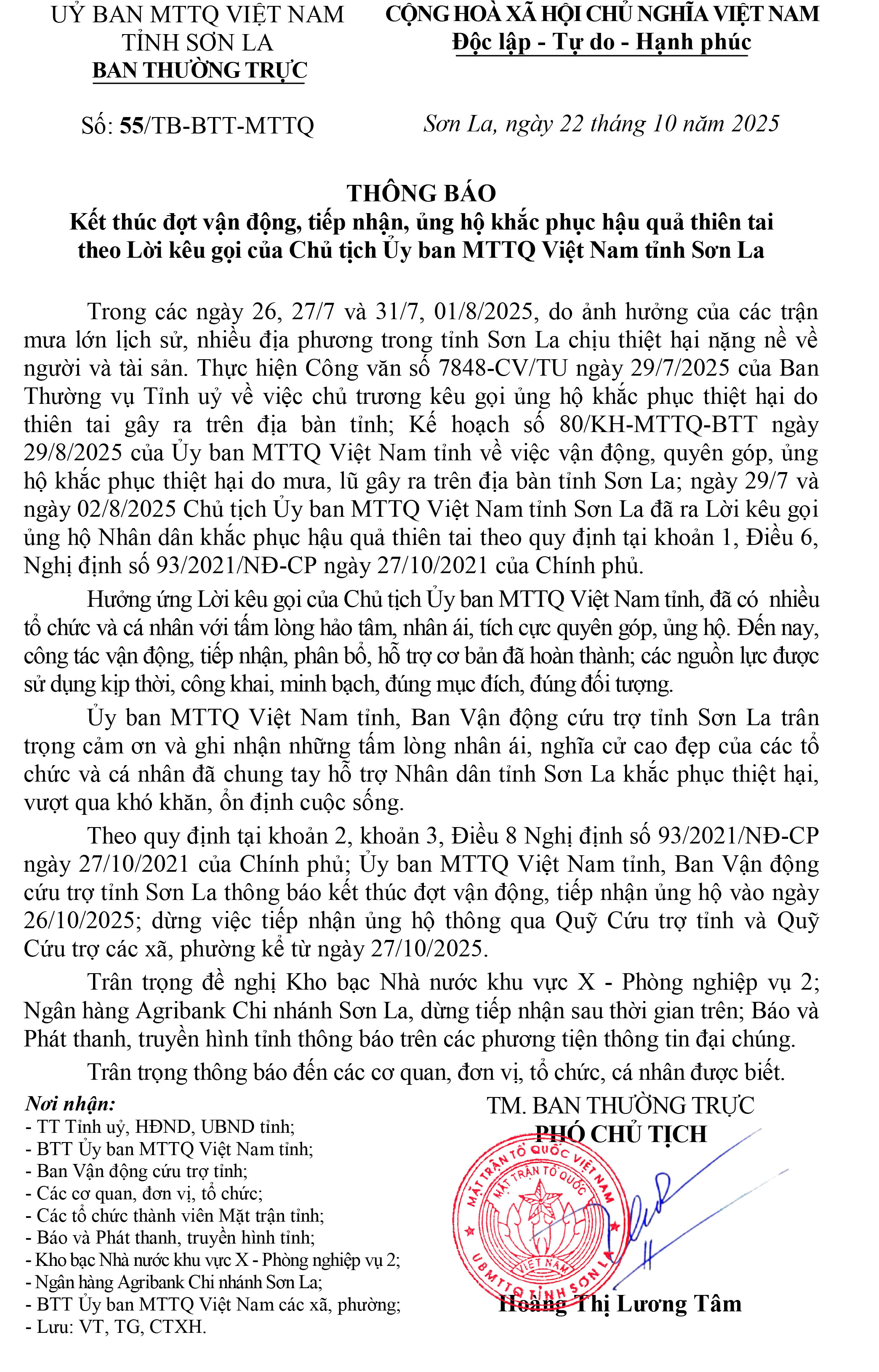 Thông báo kết thúc đợt vận động, tiếp nhận, ủng hộ khắc phục hậu quả thiên tai theo Lời kêu gọi của Chủ tịch Ủy ban MTTQ Việt Nam tỉnh Sơn La