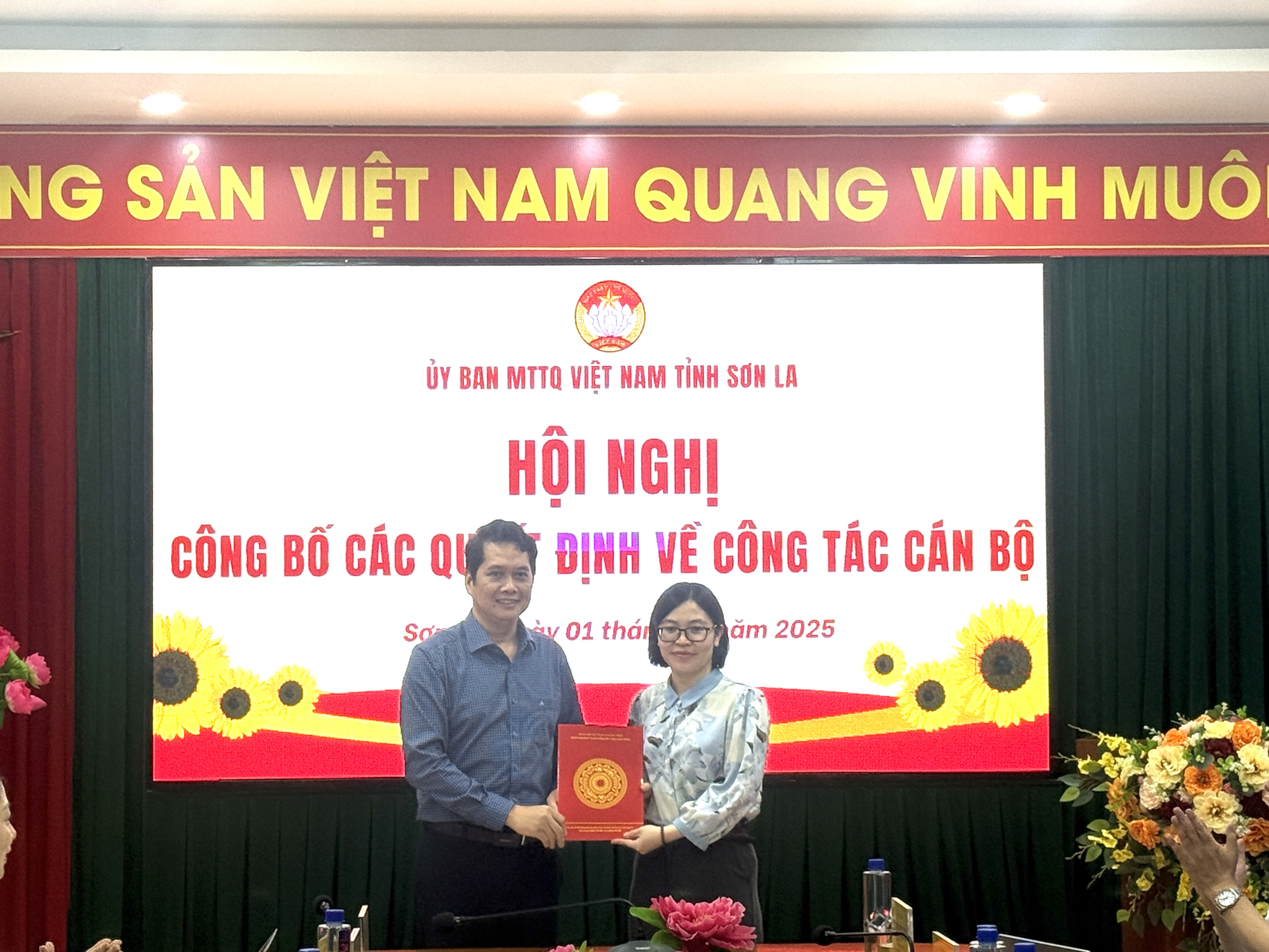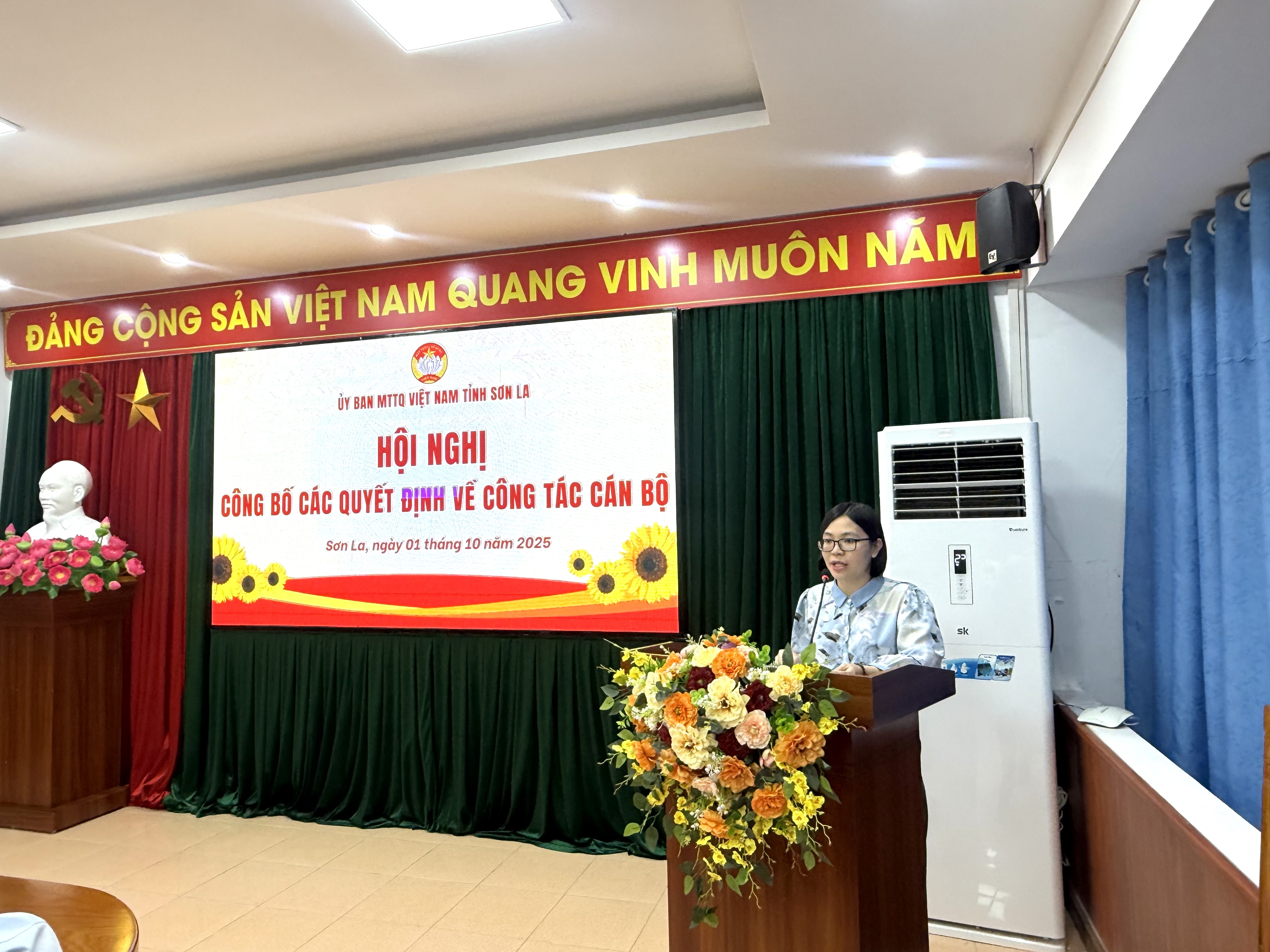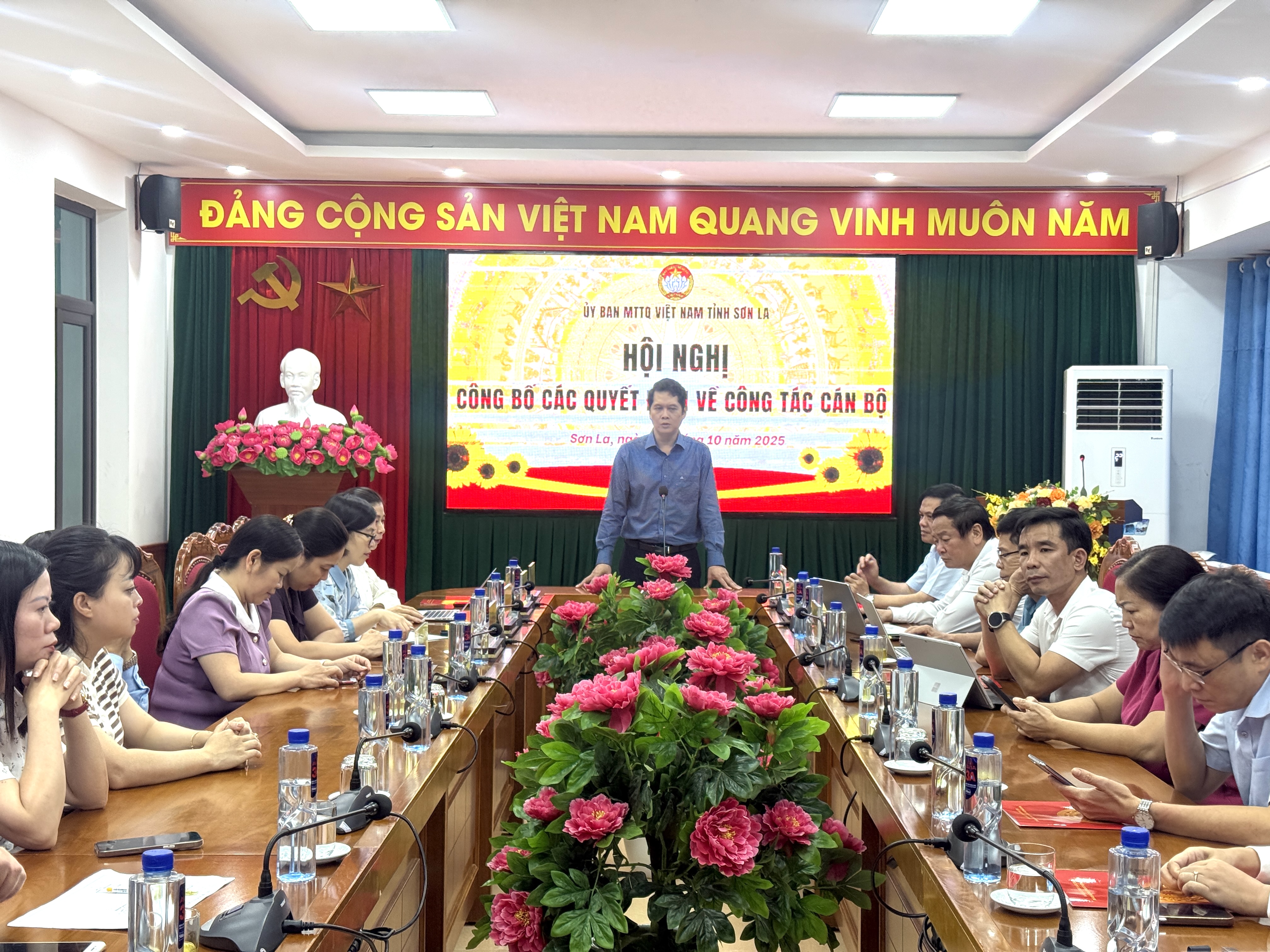 Hội nghị đã công bố Quyết định số 282/QĐ-MTTW-BTT ngày 26/9/2025 của Ban Thường trực Trung ương MTTQ Việt Nam về công nhận chức vụ Phó Chủ tịch MTTQ Việt Nam tỉnh Sơn La, nhiệm kỳ 2024 - 2029 đối với đồng chí Cầm Thị Hồng Duyên, Chủ tịch Hội LHPN tỉnh; các Quyết định của Ban Thường trực Uỷ ban MTTQ Việt Nam tỉnh về việc điều động, bổ nhiệm đồng chí Cầm Văn Cường, Phó trưởng Ban Tuyên giáo, công tác xã hội giữ chức vụ Phó trưởng Ban Công tác Hội quần chúng; đồng chí Phùng Thị Minh Tâm, Phó trưởng Ban Công tác Hội quần chúng giữ chức vụ Phó trưởng Ban Dân chủ, Giám sát và phản biện xã hội, Cơ quan Ủy ban MTTQ Việt Nam tỉnh.