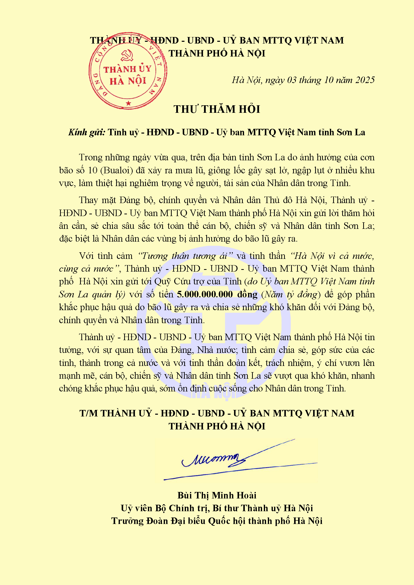 Những ngày qua, do ảnh hưởng của thiên tai, nhiều địa phương trên địa bàn tỉnh Sơn La bị thiệt hại nặng nề về người và tài sản. Chia sẻ với những khó khăn của tỉnh Sơn La, Thành ủy, HĐND, UBND, Ủy ban MTTQ Việt Nam Thành phố Hà Nội đã gửi thư thăm hỏi, động viên và ủng hộ 5 tỷ đồng để chung tay, góp phần cùng tỉnh Sơn La khắc phục thiên tai, giúp nhân dân sớm ổn định cuộc sống.