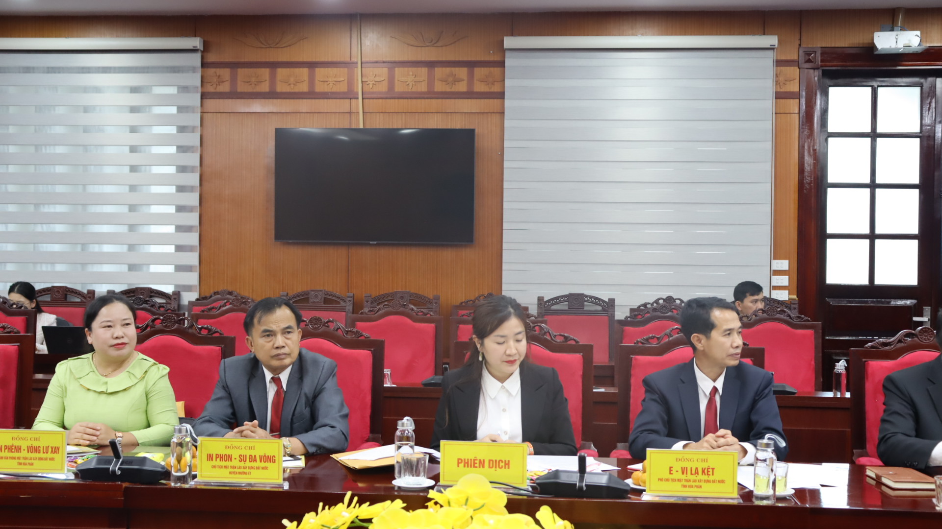 Trong không khí thắm tình đoàn kết, hai bên đã đánh giá kết quả phối hợp trong thời gian qua, trao đổi thông tin về tình hình hoạt động công tác Mặt trận; chia sẻ kinh nghiệm trong việc nâng cao hiệu quả tuyên truyền, vận động, tập hợp các tầng lớp Nhân dân, củng cố và phát huy sức mạnh khối đại đoàn kết toàn dân tộc, tham gia xây dựng Đảng, chính quyền, giám sát, phản biện xã hội, tăng cường giao lưu Nhân dân, phối hợp giữ gìn an ninh trật tự khu vực biên giới, thúc đẩy phát triển kinh tế – xã hội và nâng cao đời sống Nhân dân vùng giáp biên.