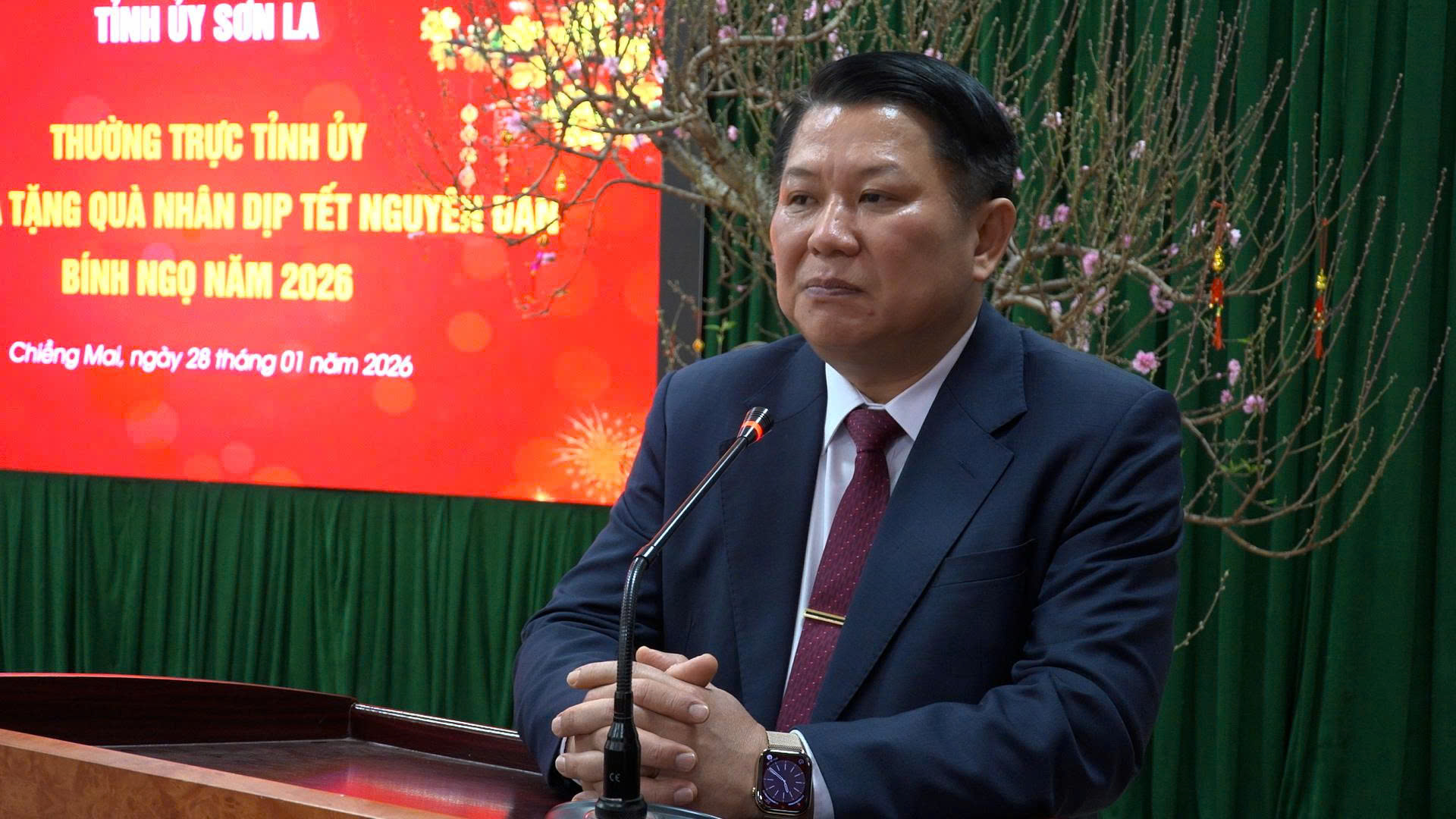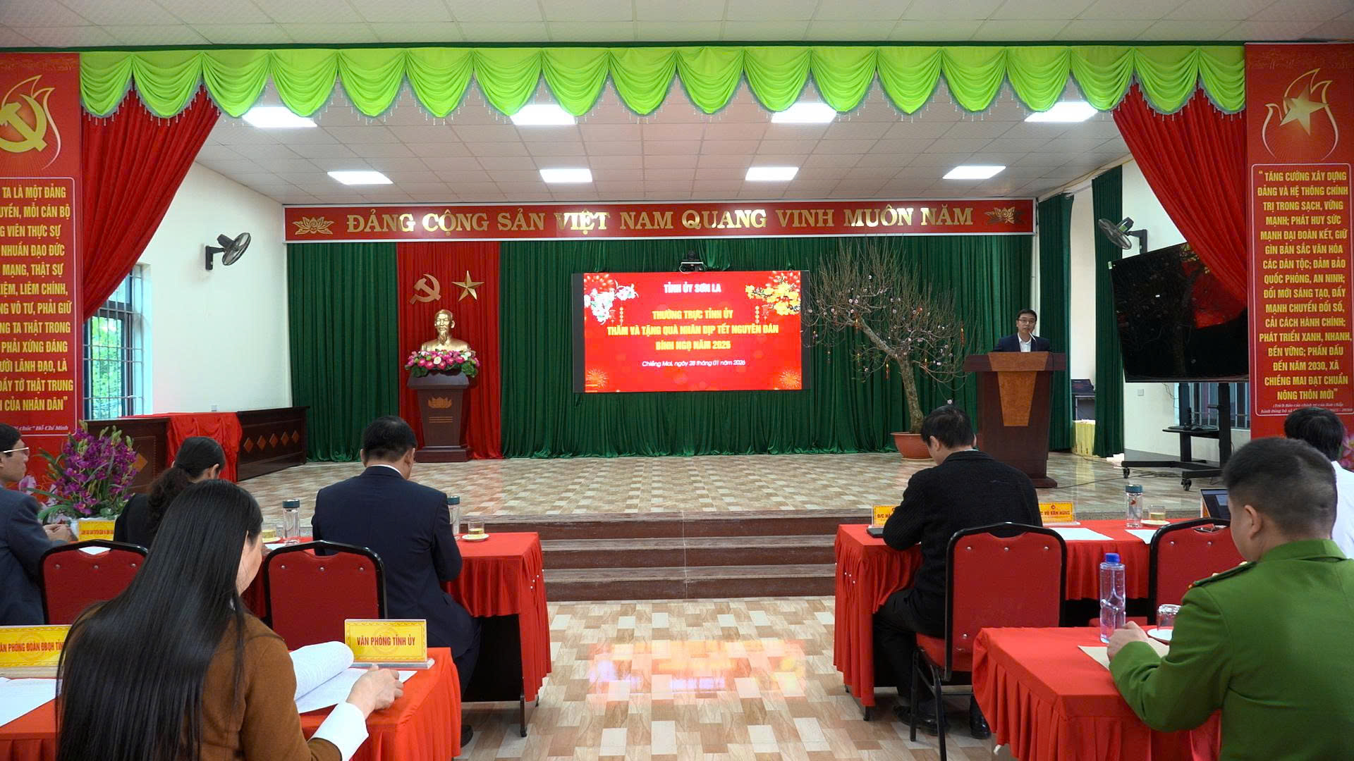 Lãnh đạo xã Chiềng Mai báo cáo kết quả triển khai các chính sách an sinh xã hội và chăm lo Tết cho Nhân dân trên địa bàn xã.