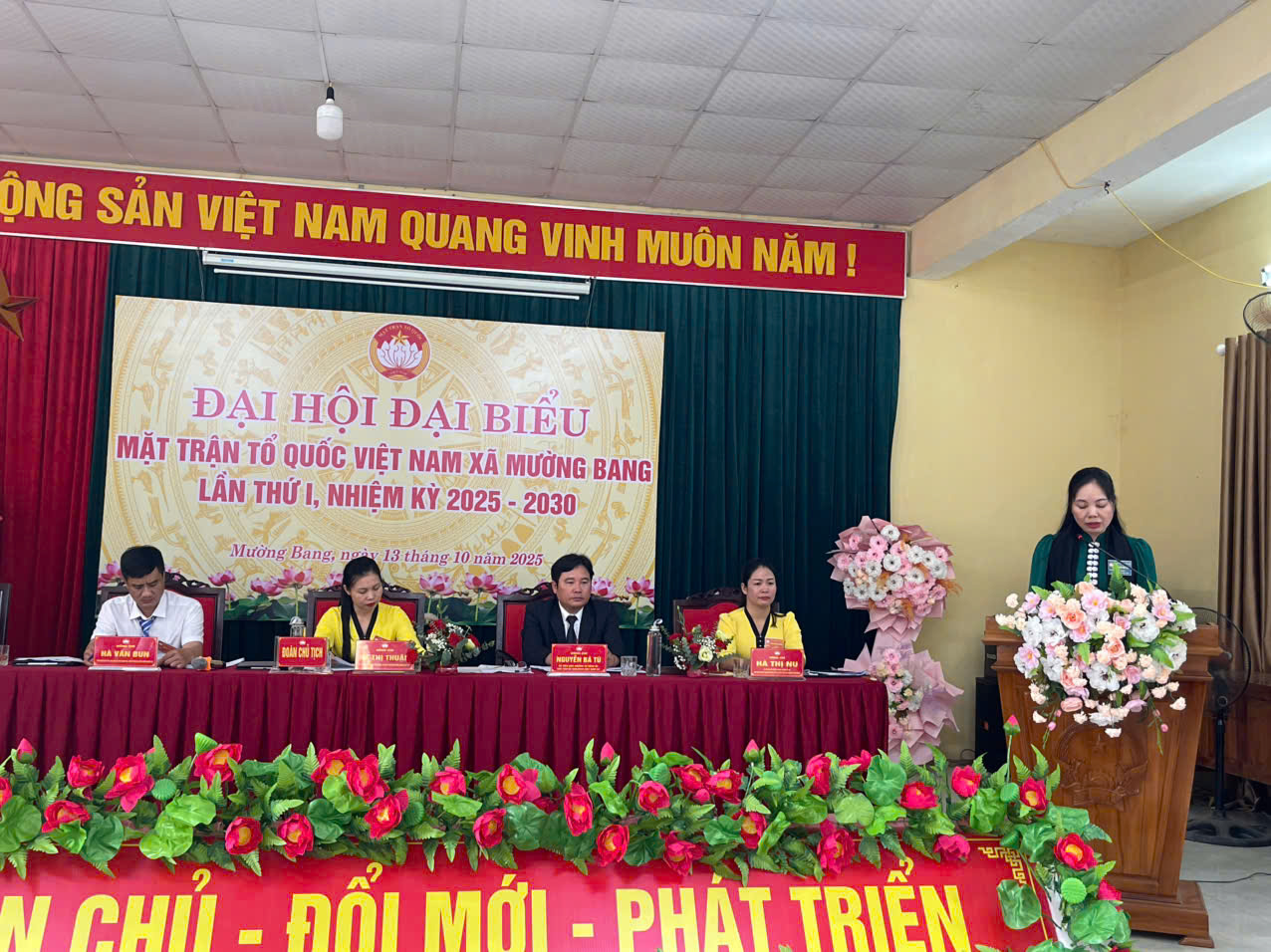 Ngày 13/10, Ủy ban Mặt trận Tổ quốc (MTTQ) Việt Nam xã Mường Bang long trọng tổ chức Đại hội đại biểu MTTQ lần thứ I, nhiệm kỳ 2025–2030. Dự Đại hội có đồng chí Hoàng Thị Lương Tâm, Phó Chủ tịch Ủy ban MTTQ Việt Nam tỉnh Sơn La, đồng chí Phan Quý Dương, Bí thư Đảng ủy xã Mường Bang, cùng lãnh đạo Đảng ủy, UBND xã và 85 đại biểu chính thức, đại diện cho các tầng lớp nhân dân, các tổ chức thành viên và cá nhân tiêu biểu trong khối đại đoàn kết toàn dân tộc của xã.