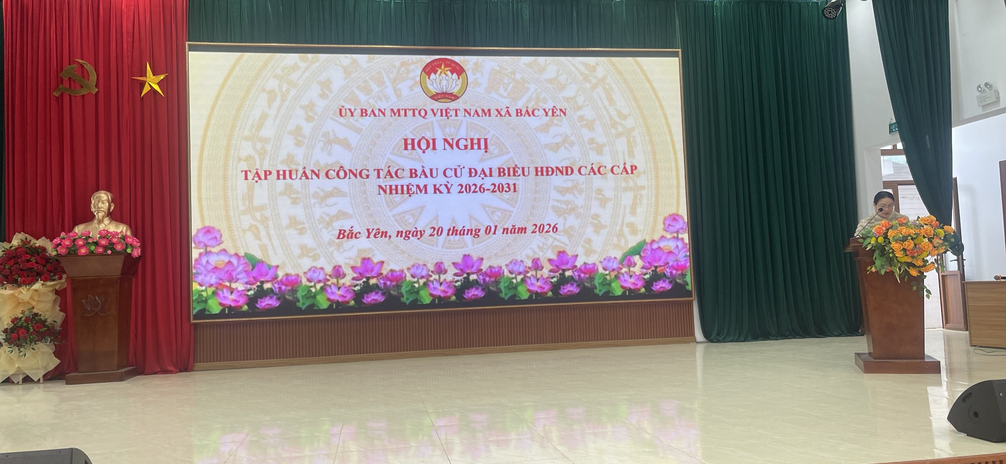 Sáng ngày 20/01, Ban Thường trực Ủy ban MTTQ Việt Nam xã Bắc Yên tổ chức Hội nghị tập huấn công tác bầu cử đại biểu HĐND các cấp, nhiệm kỳ 2026-2031. Đồng chí Lường Phú - Ủy viên Ban Thường vụ Đảng ủy, Chủ tịch Ủy ban MTTQ Việt Nam xã, chủ trì Hội nghị, cùng 121 đại biểu là đại diện lãnh đạo các cơ quan, đơn vị, các bản, tiểu khu giới thiệu người ứng cử đại biểu HĐND các cấp, nhiệm kỳ 2026-2031 và người được giới thiệu ứng cử đại biểu HĐND xã, nhiệm kỳ 2026-2031.