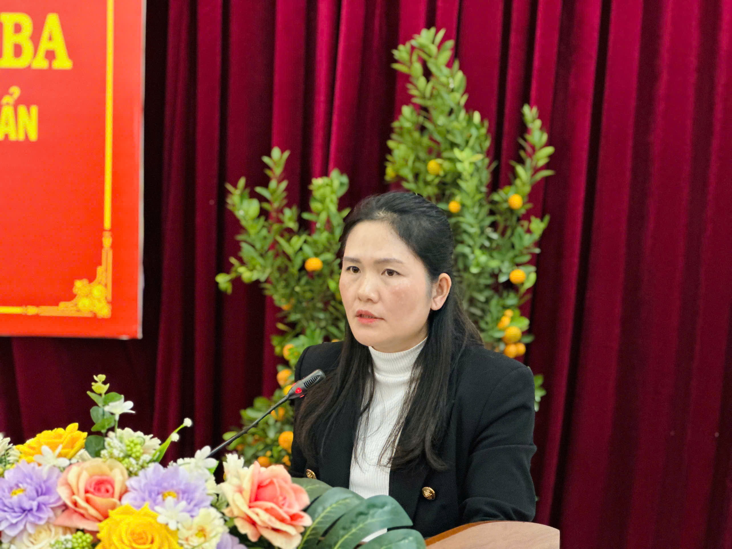 Đồng chí Lò Thị Hoa - Ủy viên Ban Chấp hành Đảng bộ, Chủ tịch Ủy ban MTTQ Việt Nam xã phát biểu khai mạc Hội nghị.